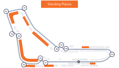 - ulaznice za Formulu 1 u subotu i nedjelju: general admission (stajaća mjesta koja nisu numerirana, omogućuje pristup određenim dijelovima staze koji su označeni za GA posjetitelje — na “unbranded” terenu te travnatim površinama)