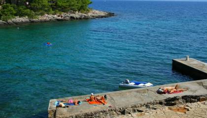 Plaža: stjenovita, dijelom betonirana, manja šljunčana