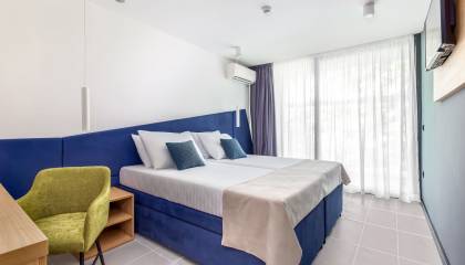 Sobe: Lcd Sat TV, telefon, mini bar u hotelu, sef, sušilo za kosu, WI-FI, dječji krevetić (besplatno); sobe u hotelu na park/morsku stranu, sobe u paviljonu s balkonom na morsku stranu, pomoćni ležaj u standard sobi u Holiday Resortu isključivo na upit