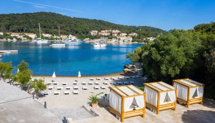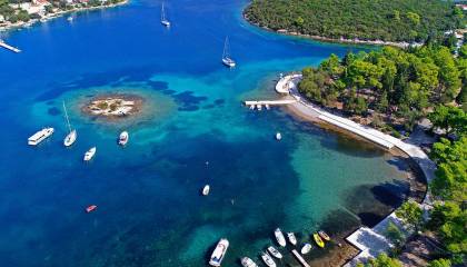 Položaj: u mirnoj uvali Zaljev školjki, 2 km od grada Korčule