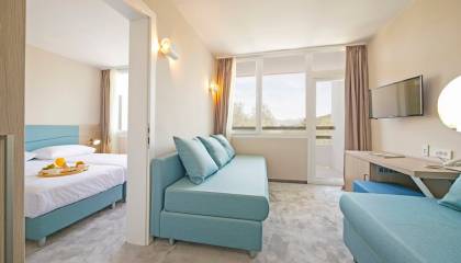 obiteljska soba (31-36 m2) – 2 odvojene sobe, kupaonica s kadom i kupaonica s tušem, balkon ili terasa