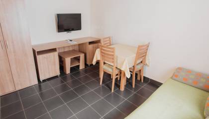 Apartman A 1/2+1- jednosobni apartman cca. 32 m2, manja spavaća soba s bračnim krevetom i garderobom, dnevni boravak s kaučem na razvlačenje kao pomoćni ležaj, stol, stolice, komoda, terasa sa sjedaćom garniturom, smještaj je za max. 2 odrasle osobe i 1 dijete do 12 godina.