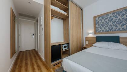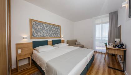 Sobe superior nove balkon park/morska strana 4*: obnovljene 2018. i 2019. godine, sobe na park stranu se nalaze se u prizemlju, 1., 2. i 3. katu zgrade A, a sobe morska strana se nalaze na 4., 5., 6., 7. i 8. katu zgrade A; sve sobe su trokrevetne (odvojeni ležaji + kauč na razvlačenje) s balkonom; dio okrenute na morsku stranu, a dio na park stranu; klimatizirane, kupaonica s tušem/kadom, sušilo za kosu, LCD sat TV, mini hladnjak, sef, besplatan WI-FI