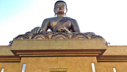 Doručak. Organizirani transfer do zračne luke te prijava na let za Paro, Butan. Let iznad Himalaja prepun fascinantnih pogleda na planinske vrhove i prirodu koja nikoga ne ostavlja ravnodušnim. Po slijetanju, vožnja prema Thimpu. Na putu stajanje kod Chuzom, značajno mjesto u Butanu, smješteno na ušću dviju rijeka Paro i Thimphu koje krase tri različite vrste stupa – tibetanska, butanska i nepalska. Ručak u lokalnom restoranu. Po dolasku u Thimpu, prijava u hotel. Odlazak u razgled. Prva stanica razgleda je Kuensel Phodrang ili Buddha Point poznat po svom divovskom brončanom kipu Bude Shakyamunija, koji stoji na visini od 51,5 metra što ga čini jednim od najvećih kipova Bude na svijetu. Kip je pozlaćen i nalazi se na vrhu brda s pogledom na dolinu Thimphu, odakle seže zadivljujući panoramski pogled na okolne planine i krajolik. Posjet memorijalnoj stupi koju neprestano ljudi obilaze izgovarajući mantre i vrteći amajlije u rukama. Izgradnja ove znamenitosti bila je ideja trećeg kralja Butana, oca modernog Butana koji je želio podići spomenik svjetskom miru i prosperitetu. Dovršena 1974. nakon njegove nepravovremene smrti, služi i kao spomen na pokojnog kralja i kao spomenik miru. Posjet tvrđavi i samostanu Trashichhoedzong, remek-djelu butanske arhitekture, vjerskog značaja i bogate kulturne baštine. Također služi kao ured kralja Butana i vladinih ministarstava. To je mjesto za razne vjerske i svjetovne ceremonije, uključujući godišnji Tsechu (vjerski festival) i službene događaje poput krunidbe kralja i proslave Dana državnosti. Povratak u hotel, večera i noćenje.